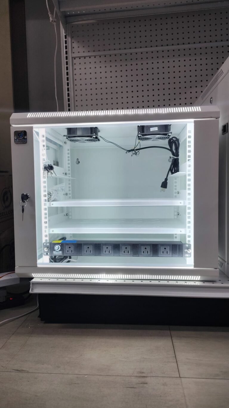 27U Secure Network Cabinet. Cable Management. Glass Door. White and Light